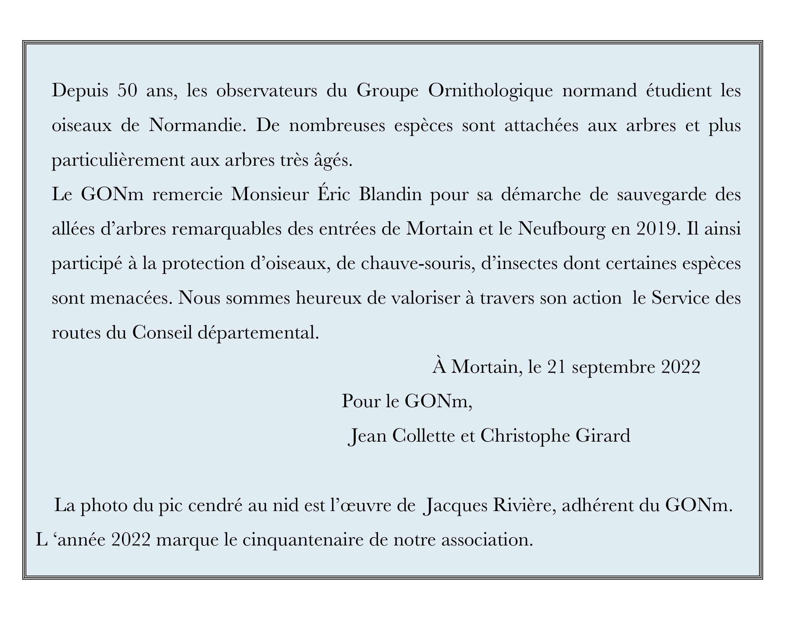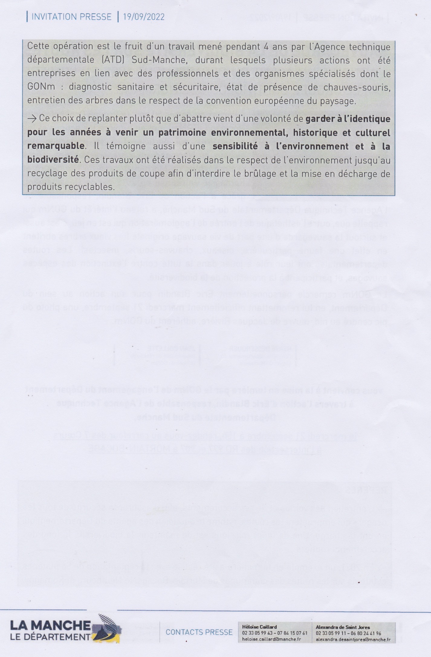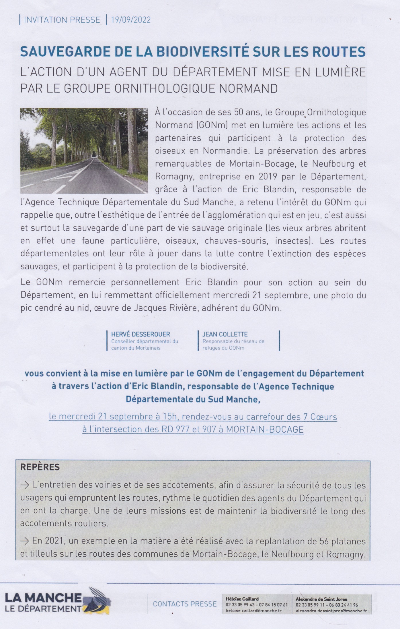 Nous connaissons tous le rôle d'entretien et de sécurisation des routes départementales et de leurs abords par les agents de ce service. L'impact des travaux d'entretien sur la biodiversité est de plus en plus pris en compte : le calendrier retardé des interventions en particulier a évolué. Mais la démarche de sauvegarde des alignements des arbres remarquables des entrées de Mortain et le Neufbourg menée par Eric va bien au delà. C'est pourquoi nous avons choisi de mettre en lumière son travail en faveur des vieux arbres. Une rencontre avec la presse locale en présence de Monsieur Desserouer, conseiller départemental, vice président de l'Agglomération et maire de Mortain-Bocage a été organisée le 21 septembre. Le service communication du Conseil départemental s'est associé à notre manifestation. Un texte de présentation a été préparé pour la presse et le service communication de Saint-Lô. De son côté le service communication du Conseil départemental a rédigé un document destiné aux agents et à l'invitation de la presse. Au dos de la photo (don de Jacques Rivière) de pic cendré, une dédicace signée des deux représentants du GONm. Partie non négligeable de la rencontre, les échanges avec la presse permettent de nouer des contacts et d'élargir le sujet. Par exemple, la destruction de nombre des jeunes arbres plantés par un malfaisant probablement en désaccord avec la démarche de sauvetage...