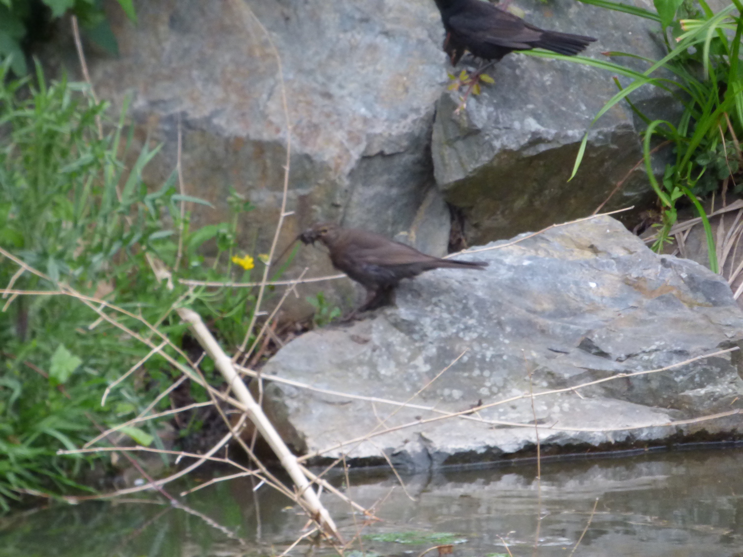 - un couple de merles affairé le long du bief : la femelle se pose derrière une grosse pierre sur la rive et s'active - je ne vois que la tête dépasser par intermittence -; elle repart à plusieurs reprises avec un paquet de vase au bec et file directement vers un buisson qui cache la nid en construction. Son comportement peu farouche m'incite à la prendre en (mauvaise) photo. Le mâle l'attaque à deux reprises, tentant probablement (?) de l'obliger à cesser ce va et vient qui dénonce son activité. - un buisson de bourdaine le long du bief accueille les chenilles du papillon Citron. Même si les entailles ne sont pas exactement symétriques dans ce cas, il y a peu de doutes sur la détermination. Le positionnement dans l'axe de la nervure principale est aussi caractéristique. Heureusement qu'il n'y a pas (?) de bourdaine horticole décorative à feuillage pourpre, les prédateurs auraient la tâche facile! C'est pourtant ce qui arrive sur les prunus, les chênes, les hêtres, les noisetiers, etc. "rouges". - pour le plaisir de la terminologie (demander l'avis des poissons aussi)... Cherchez Lee Wulf sur un moteur de recherche, le roi du hameçon sans ardillon. - Une des préconisations de gestion émises l'an dernier a été mise en oeuvre : créer un sentier le long de la rivière dans la partie non fauchée pour limiter la déambulation "erratique" des promeneurs dans la prairie. Souhait en partie exaucé, la végétation de la rive est beaucoup plus variée que celle du reste de la prairie classiquement couverte de graminées denses. Mais il va encore falloir préciser que le broyeur ne doit pas s'approcher à moins d'un mètre de la rive... - pour finir, l'énigme... Des feuilles de ronce torsadées. Qui est responsable de cette déformation?