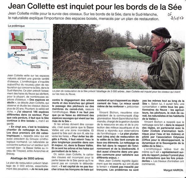 Un plan d'abattage de 3000 arbres est prévu dans la vallée de la Sée, une des rivières se jetant dans la Baie du Mont Saint-Michel. La réserve de Tirepied est située dans cette vallée encore très boisée : les différents suivis effectués pendant de nombreuses années ont permis d'obtenir une connaissance très fine de la biodiversité de cet ensemble. Les craintes par rapport à l'impact de ces abattages sur l'avifaune sont réelles et justifiées dans l'article ci-dessous. Ce plan d'abattage répond plus à la demande d'activités de loisirs comme la pêche ou le canoé-kayak qu'à des exigences naturalistes. Espérons que grâce à l'intervention du GONm, il sera effectué de la manière aussi douce et respectueuse que déclaré dans le projet.