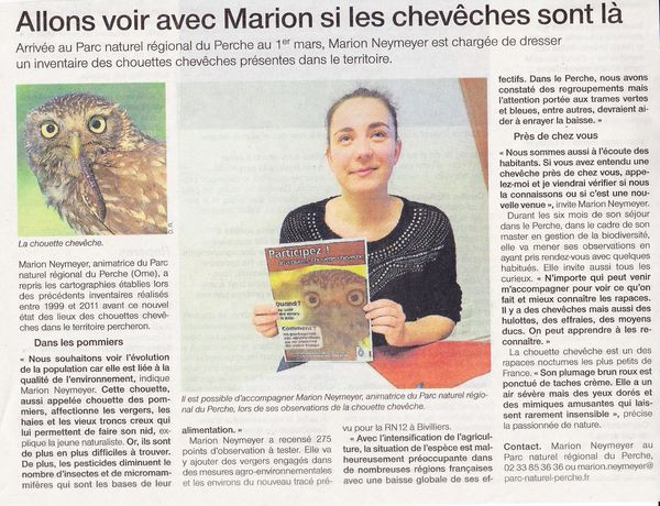 Cet article découvert dans Dimanche Ouest-France nous indique que la petite Athene noctua est recherchée dans le Parc Régional du Perche. Marion Neymeyer animatrice au Parc Régional du Perche est chargée de prospecter 275 points différents mais aussi de recueillir toutes les informations sur la chouette chevêche. Il lui sera ainsi possible d'obtenir une idée de la répartition actuelle de cet oiseau très sensible aux modifications des milieux agricoles et des pratiques agricoles.