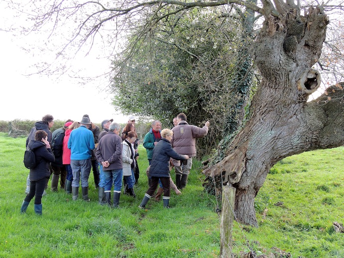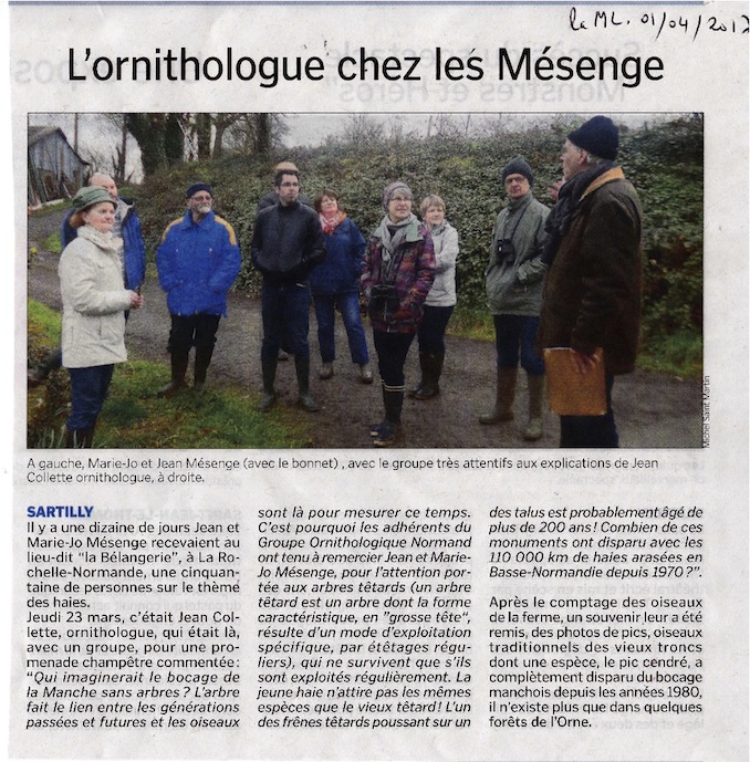 Lors de la participation du GONm à la rencontre "plantations de haies" organisée par la Chambre d'agriculture le 10 mars à la Rochelle Normande/50, ferme de la Bélangerie, la découverte d'un frêne têtard remarquable a été l'occasion de remettre en lumière ces monuments régionaux que sont les vieux têtards. Une sortie sur la ferme de Jean et Marie-Jo Mésenge a été organisée par le GONm avec leur accord le 23 mars. Nous avons donc fait (ou tenté vu nos conversations nourries!) un relevé des oiseaux des haies dont certaines sont récentes (1 km planté il y a 15 ans) puis invité la presse à nous rejoindre pour mettre à l'honneur les têtards ainsi que les agriculteurs héritiers soigneux de ces arbres qui nécessitent un entretien par coupe tous les 10 ans environ. Un petit souvenir sous forme de photos de pics a été remis à Jean et Marie-Jo. Trois journalistes ont répondu à l'invitation du GONm, des articles à venir mettront donc en lumière ce patrimoine bien menacé qui régresse chaque hiver un peu plus : coupé au pied, le vieux tronc ne rejettera plus de souche comme il le faisait en tête depuis 150, 200 ans ou plus...