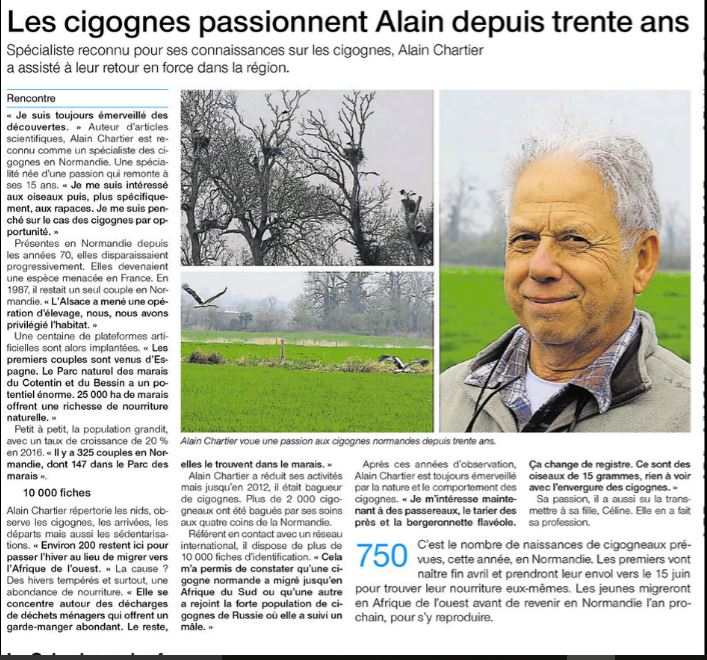 Un bel article à propos des cigognes blanches de Normandie et de celui qui les a baguées et répertoriées pendant 30 ans, notre collègue Alain Chartier. Trente ans, cela valait le coup de tirer un coup de chapeau à celui qui a tant fait pour que la cigogne blanche se porte aussi bien dans notre région et devienne aujourd'hui emblématique de l'avifaune normande. Alain connaît tout des cigognes qu'il a baguées pendant toutes ces années et peut en dérouler la généalogie sans problème. Cet article est le beau récit d'une passion.