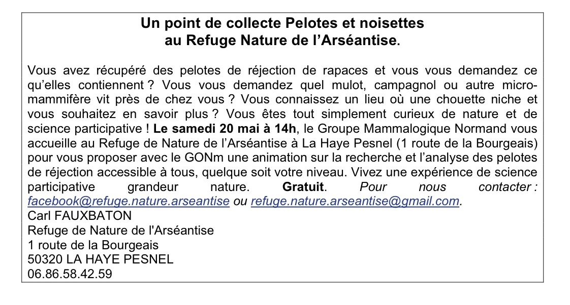 Collaboration entre le GMN et le GONm sur un refuge à la Haye-Pesnel : grâce au dynamisme de Carl et Anne, une séance de démonstration de détermination des proies contenues dans les pelotes est prévue samedi 20 mai à partir de 14 h. On peut venir les mains dans les poches avec seulement sa curiosité en bandoulière! Il faut juste penser à prévenir pour prévoir assez de matériel (et de verres pour l'apéro)...