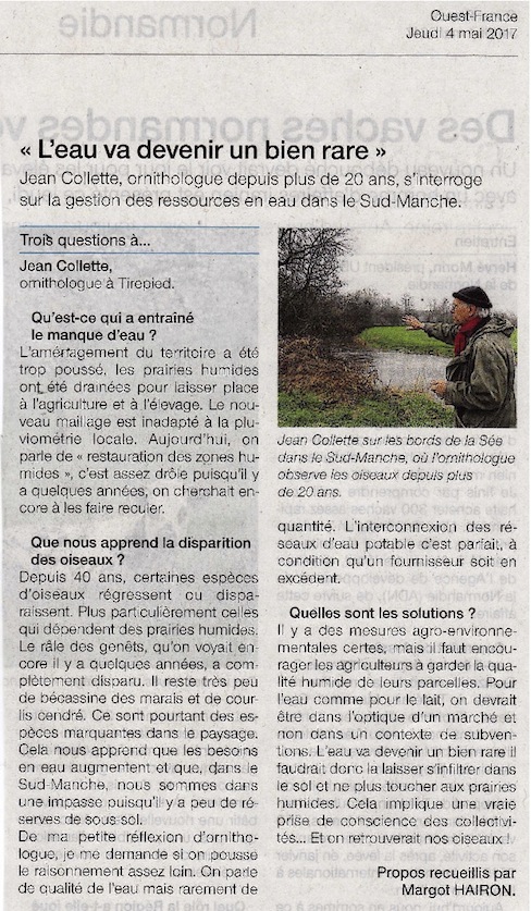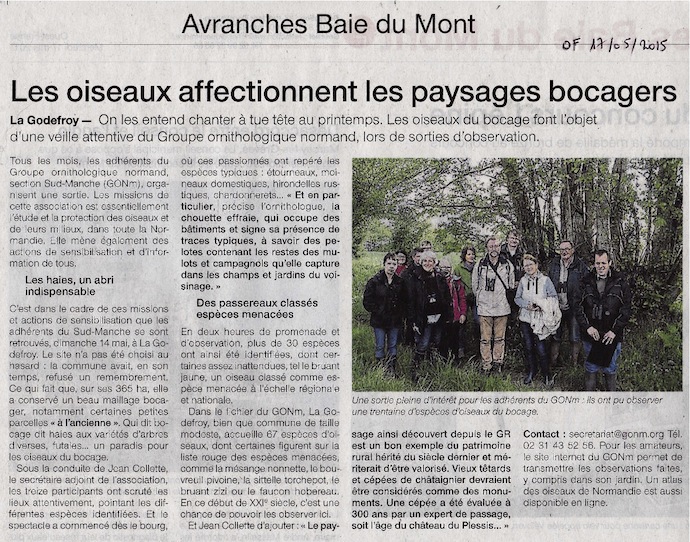 L'animation mensuelle de nos collègues du Sud Manche a porté ses pas vers La Godefroy, petite commune située sur la ligne de crête qui part d'Avranches vers l'Est de la Normandie. Le bocage a évité le remembrement et a donc gardé ses caractères particuliers très accueillants pour la vie sauvage et les oiseaux. Cela valait le coup de déplacer la presse, Ouest-France en l'occurrence ici.