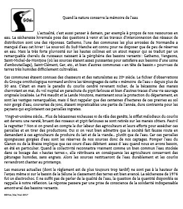 Notre collègue Jean Collette s'interroge dans cet article sur la gestion des zones humides des hautes vallées fluviales (la vallée de la Sée ici). Les conséquences de cette gestion sont importantes pour l'avifaune : l'assèchement de parcelles jusqu'alors humides une partie de l'année afin qu'elles deviennent exploitables pour l'agriculture a entraîné la disparition d'espèces nicheuses comme le courlis cendré et la bécassine des marais ou encore le pipit farlouse.