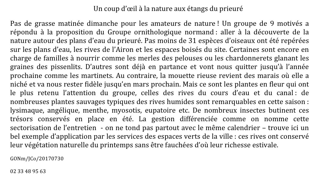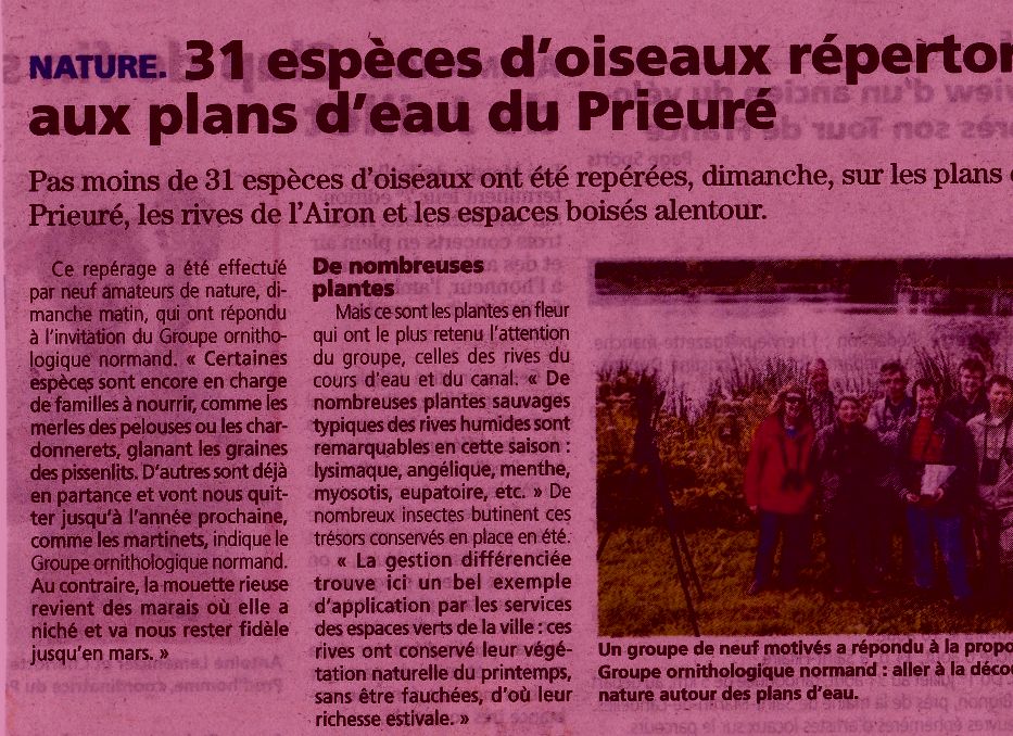 Cet interview est à compléter par la lecture de la récente publication d'études sur l'avifaune caennaise parues dans le Cormoran, revue scientifique du GONm, N°83. Ces études mériteraient, à coup sûr, elles aussi, un coup de projecteur dans le journal.