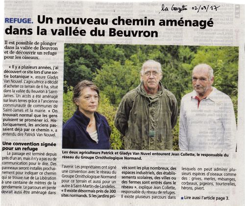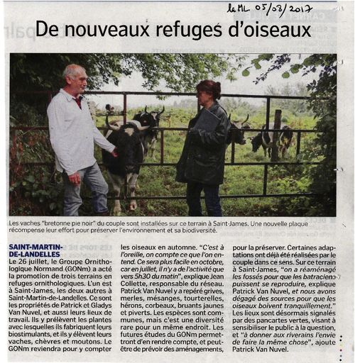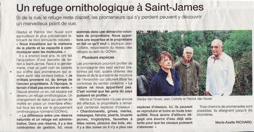 Gladys et Patrick Van Nuvel ont souhaité placer leurs propriétés à Saint-James et Saint-Martin de Landelles/50 en refuge de nature GONm. Ils pratiquent sur ces terres un peu humides l'élevage d'espèces domestiques de plus en plus rares, comme la vache pie noire bretonne et le mouton de l'Avranchin. Ils y prélèvent des plantes dont ils extraient des bio-stimulants. Le trio des organes de presse du Sud Manche étaient présents pour l'inauguration du refuge, soit la Gazette de la Manche, la Manche Libre et Ouest-France. Et miracle, il y eut 3 articles.