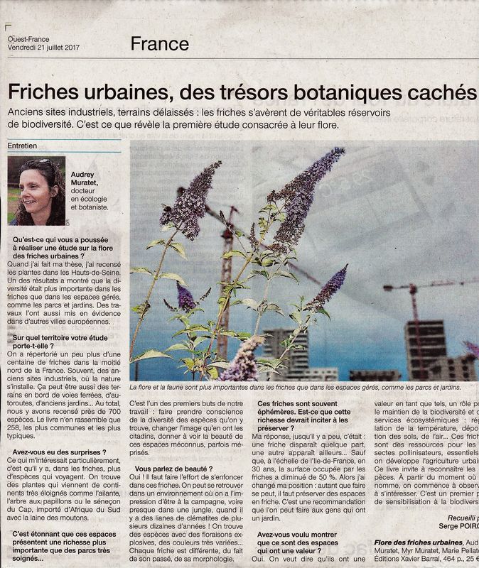 Trouvé dans Ouest-France, cet article traite des friches urbaines. C'est l'intérêt botanique de ces espaces qui est abordé par la botaniste Audrey Muratet . Qui dit plantes sauvages, dit insectes et oiseaux, d'où l'intérêt de cet interview pour les amateurs d'oiseaux. La nature reprend peu à peu ses droits (temporairement ou pour de longues périodes ) sur ces espaces qui correspondent souvent à des terrains inoccupés ou à des sites industriels abandonnés. En général, ces terrains déjà nivelés ou tassés sont souvent secs et ensoleillés et ont une végétation clairsemée qui atteint rarement de grandes hauteurs. La diversité de la flore peut y être très riche et plus importante que dans des parcs urbains ou des jardins de ville.