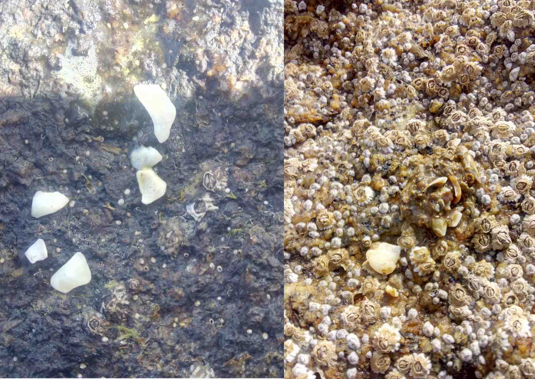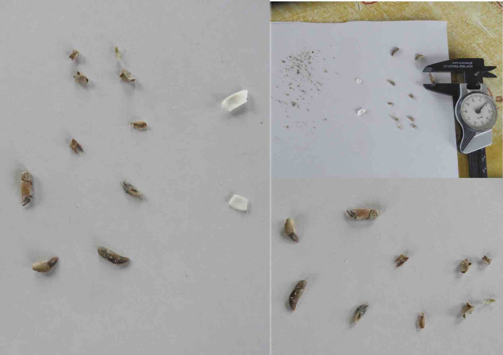 Au printemps dernier, après avoir observé deux oiseaux en train de régurgiter, un régurgitat a pu être récupéré et l'autre photographié. Ce dernier présentait seulement des morceaux de coquille, peut être de littorine, mais je ne peux rien assurer. Dans le premier, il y avait quelques morceaux de coquilles et des pinces de crabes. La plus grande pince mesurait 12mm, ce qui fait, d’après mes observations, des crabes de 4,5 à 5 cm (pattes comprises). A cela, d'après nos observations sur le terrain, nous pouvons ajouter l'importance des patelles ou de vers de vase dans le régime alimentaire de l'espèce. Nous avons donc quelques idées sur ce que mangent les huitriers Chausey, mais le sujet reste à creuser !