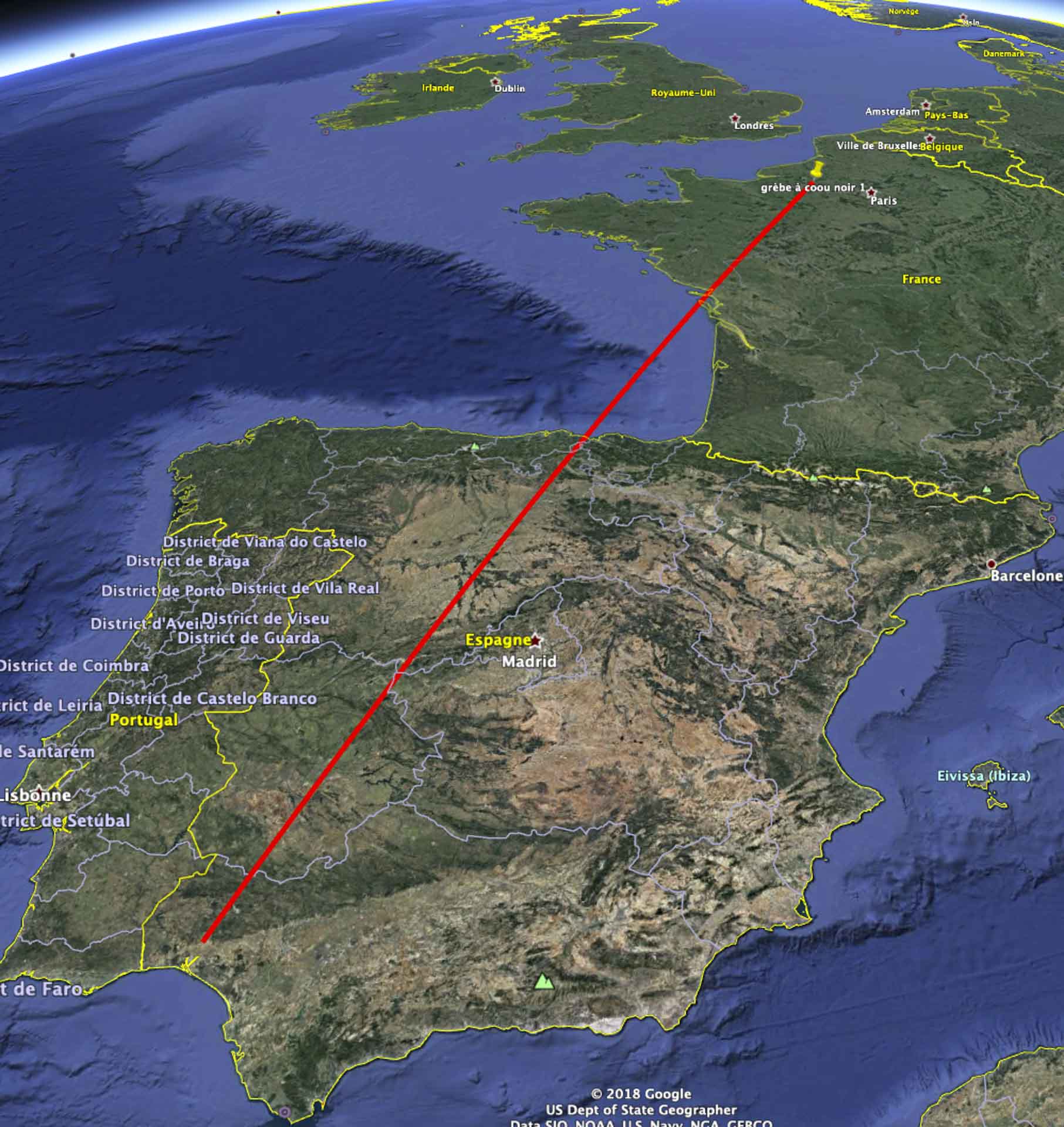 Son record a été battu par un grèbe à cou noir espagnol, qui lui aura fait 1472 km pour venir finir sa vie sur la réserve de la Grande Noé.