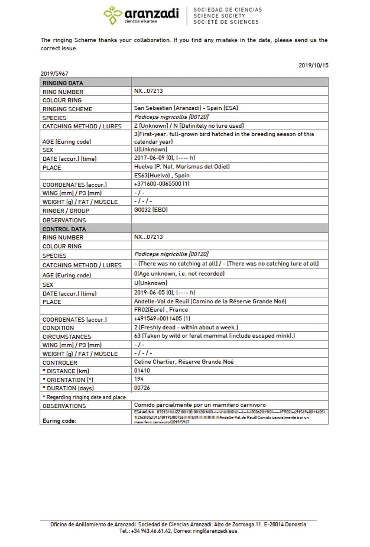 Le 5 juin, lors du suivi tri mensuel de la réserve de la Grande Noé, je fais la macabre découverte de ce grèbe sur le chemin, mangé partiellement par un mammifère carnivore. Je vous en avais informé fin juin mais le seul élément que nous avions, c’est qu’il était espagnol et potentiellement de la région de San Sébastien d’après sa bague. Sa « fiche d’identité » a été difficile à trouver car il a été bagué par un centre de baguage dissident de celui de Madrid.