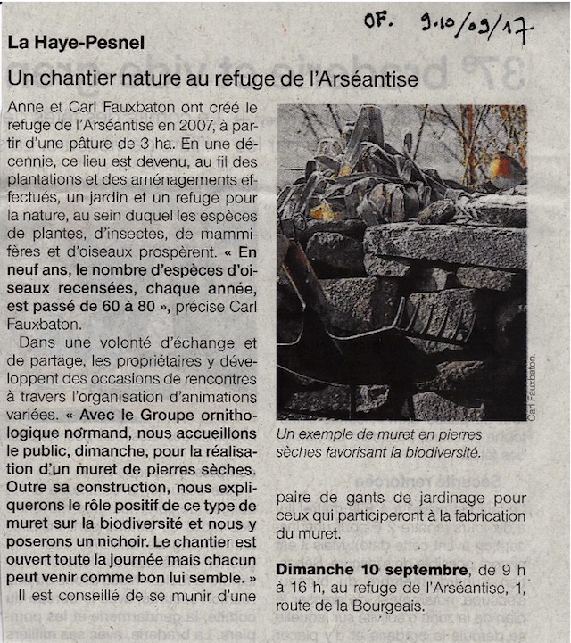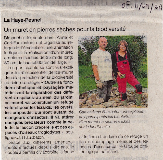 Suite du 531 avec un article de Ouest-France rendant compte du chantier de construction d'un muret de pierres sèches dans le refuge GONm de l'Arséantise à La Haye-Pesnel/50. Anne et Carl Fauxbaton, le propriétaire des lieux et initiateurs du chantier , rappellent l'intérêt biologique d'une telle construction sans oublier de citer le GONm qui effectue un relevé mensuel sur le site.