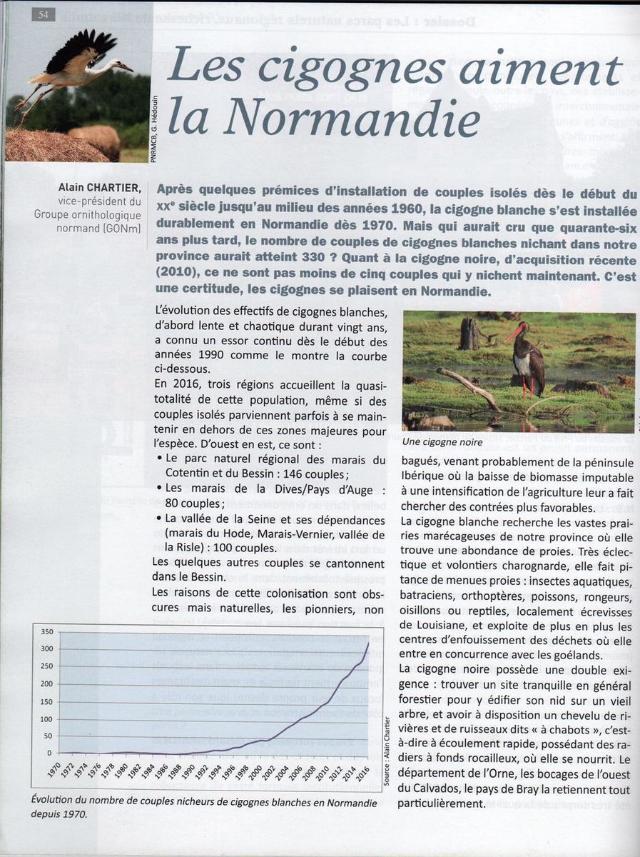 Etudes normandes est une nouvelle revue trimestrielle, papier glacé, mise en page soignée et iconographie de qualité ; le premier numéro était consacré en partie aux parcs naturels de Normandie. Tous ne sont pas évoqués mais une visite du Marais Vernier dont nous avons aujourd'hui peu d'échos est la bienvenue. Une page est accordée à Alain Chartier qui évoque l'historique de l'installation des cigognes normandes, leur biologie et leur statut actuel.