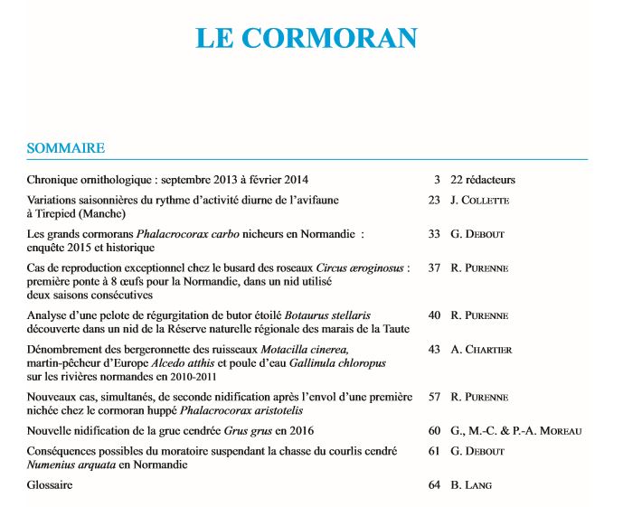Le Cormoran est la revue scientifique du GONm.Le numéro 85 est annoncé avec un sommaire très varié et très alléchant. Coup de chapeau à Bruno Lang qui réalise chaque numéro et merci bien sûr aux auteurs des articles et aux observateurs qui fournissent leurs données pour les chroniques semestrielles.