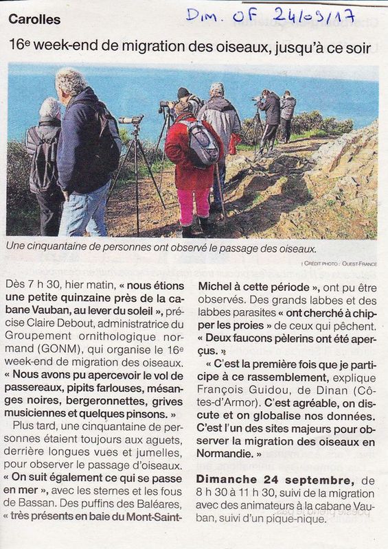 Le week-end des migrateurs de Carolles, c'était hier et avant-hier. Comme d'habitude, il faisait beau et les conditions d'observation plutôt bonnes. Le samedi: observation de la migration sur les falaises, pique-nique sous le soleil et dans la bonne humeur, expositions des photos de Xavier Corteel notamment, sorties en vallée du Lude et en vallée du Thar l'après-midi, conférences le soir. Le dimanche matin , retour sur les falaises puis pique-nique. Le programme fut copieux et riche.