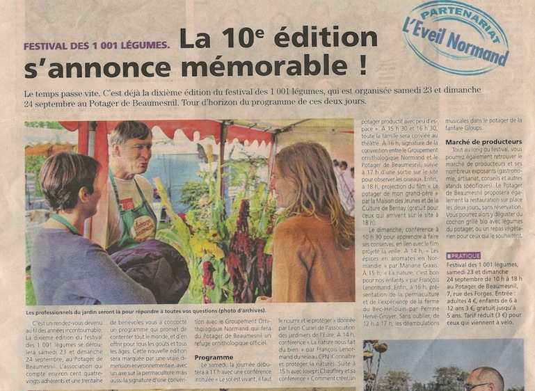L'inauguration du refuge du jardin de Beaumesnil s'est déroulée dans le cadre du festival des 1001 légumes. Elle était annoncée dans le journal "L'éveil normand" ci-dessous. Des photos de cet événement, ici : viewtopic.php?f=12&t=571#p5383