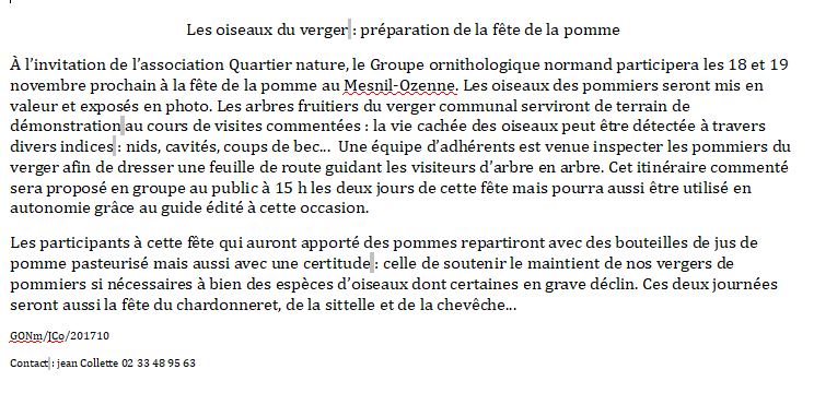 L'article ci-dessous de Ouest-France pour présenter la manifestation du Mesnil-Ozenne s'appuie en grande partie sur le communiqué de presse fourni par le GONm (voir ci-dessous). D'où les nombreuses citations d'oiseaux du verger! On ne se plaindra pas que les activités proposées par le GONm soient mises ainsi en avant.