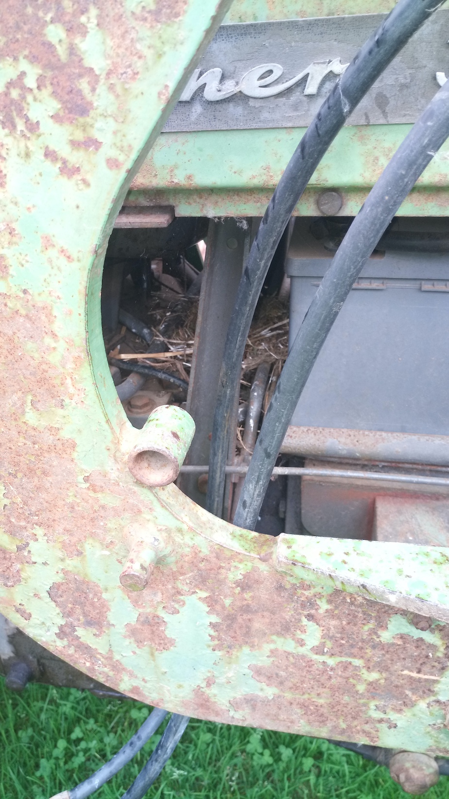 A Parigny/50, le 20 avril 2025, Jacky découvre le nid derrière la batterie quand un adulte de bergeronnette des ruisseaux en part. "Précédemment, je me suis servi de mon tracteur sans savoir qu'il était là. Depuis, mon tracteur est immobilisé."