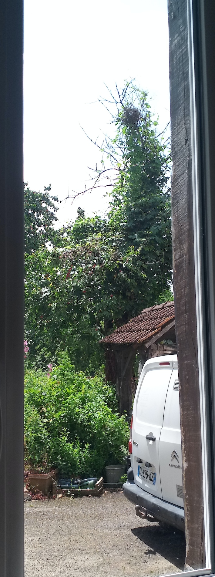 Un couple a commencé à construire son nid dans les branches mortes aux 2/3 du haut du cerisier. Le houblon grimpe sur tronc et branches mortes et va finir par camoufler le nid! (suivi chez lui parJacky Lecordier, comme les bergeronnettes du tracteur...)