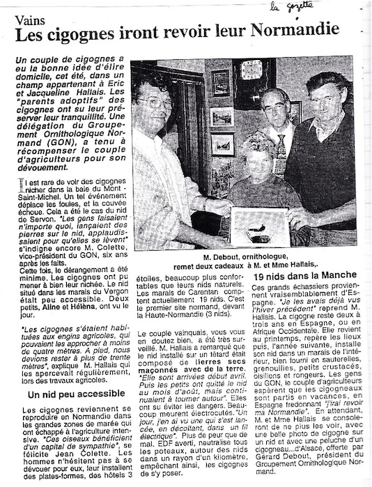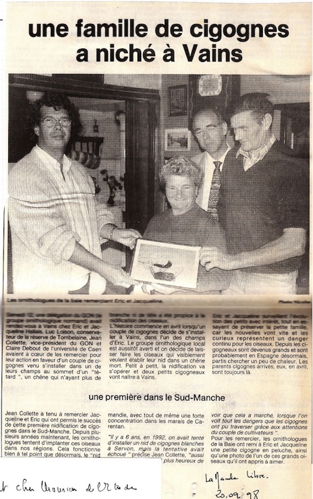 Paradoxalement, les marais de la périphérie de la baie du Mont Saint-Michel n'ont jamais réussi à retenir durablement la cigogne blanche... Cette année-là, le marais du Vergon au nord d'Avranches a vu la naissance de deux jeunes, l'occasion de remercier les agriculteurs propriétaires de la parcelle concernée. Petit montage de communication locale, Gérard et Claire sont venus de Caen, Alain Chartier a bagué les deux jeunes et les trois journaux locaux ont rendu compte de la petite manifestation avec plus ou moins de détails.