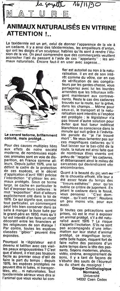 1990 11 16 - animaux naturalisés - vitrines - démarches protection -