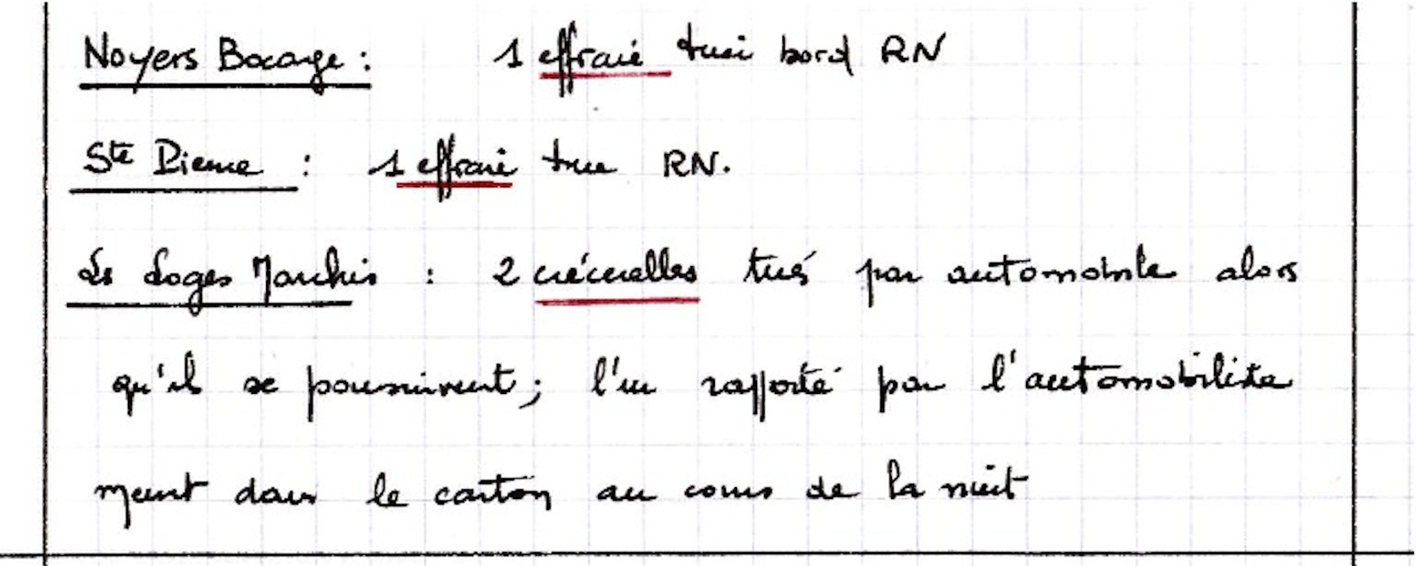 De nombreux cadavres commencent à joncher les routes. Deux exemples sont extraits du cahier de notes, du 31 janvier et du 7 février. Effraies, crécerelle, litorne, 3 exemples parmi d'autres. Les rapaces sont particulièrement nombreux sur le bord des routes, phénomène de concentration bien connu. C'est l'occasion de faire un peu de pédagogie, le discours "anti buse" étant prompt à se remettre en marche dans les conversations ...