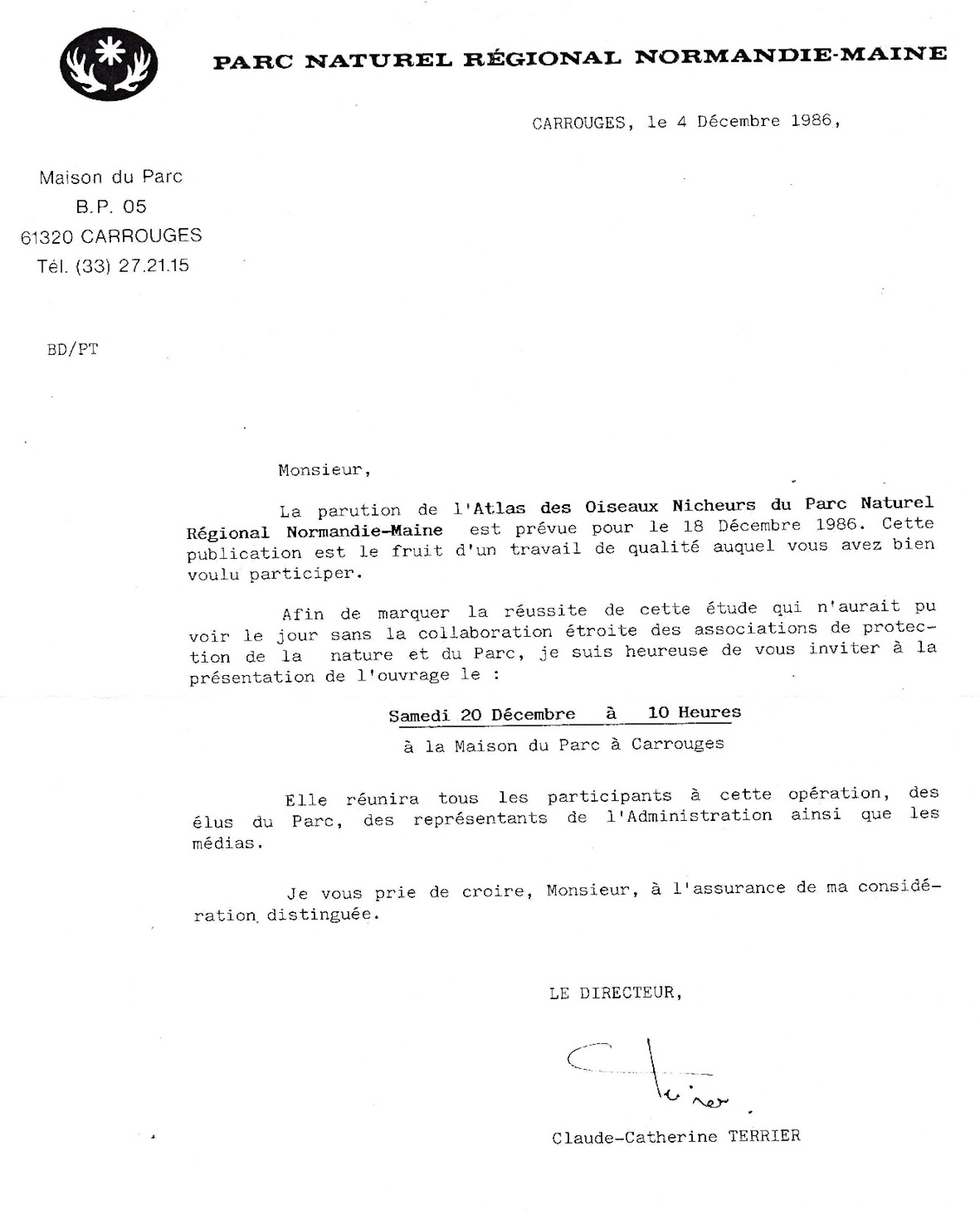 1986 12 04 - parc naturel régional Normandie-Maine - atlas - oiseaux nicheurs - invitation - Carrouges -