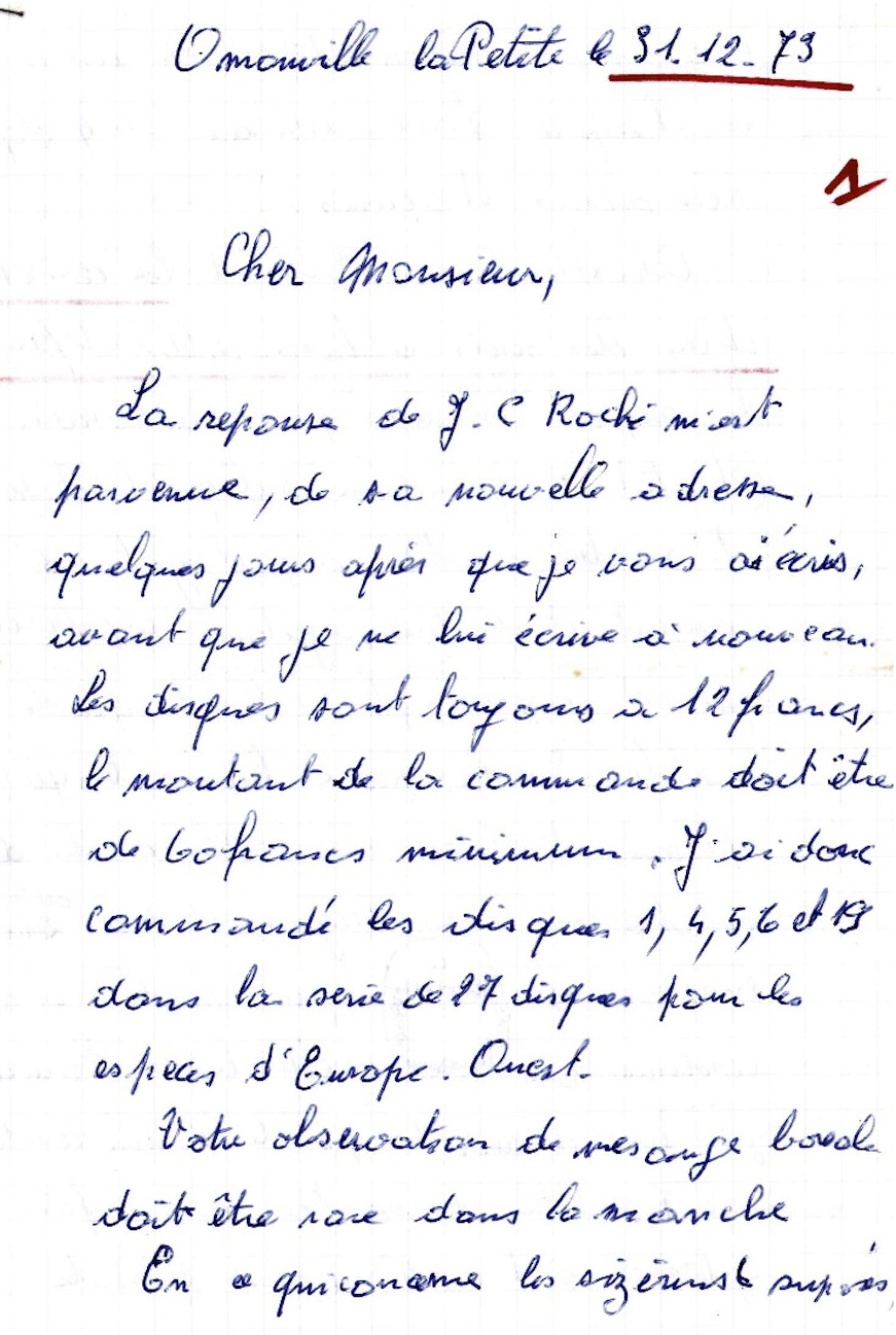 1973 12 31 - Auguste Samson - disques - chants d'oiseaux - JC Roché -