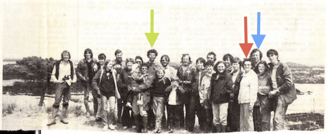 - Les participants aux dénombrements. Mademoiselle Lecourtois, organisatrice probable (flèche rouge), Luc Loison (bleu), Gérard Debout (vert). D'autres noms .. A l'extrême gauche, Thierry Grandguillot , au centre devant Gérard Debout, Alain Chartier en famille, à droite, Jacques Villain qui tentera un moment d'animer une association locale (IDIL : peut être "Illustration et défense des iles et du littoral"?), 5e à gauche, Philippe Scolan. "Nous étions jeunes et larges d'épaules", etc. et surtout jeunes et très chevelus!