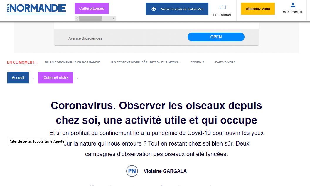 Cet article repris sur la page numérique de Paris-Normandie est très saucissonné. N'apparaissant pas d'un seul bloc, 4 captures d'écran sont nécessaires pour le reprendre dans son entier. Il manque la photo. Trois adhérents du GONm ont été pressentis pour contacter la journaliste : tous les 3 se sont manifestés. Force est de constater que le GONm a failli être oublié alors qu'il était organisateur des opérations avec la LPO. Le suivi des oiseaux évoqués est-il le suivi STOC?