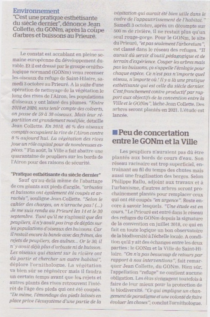 L'article de la Manche libre est un peu excessif (je n'ai pas dit que des nids avaient été détruits... vu la saison!) mais il a au moins l'avantage de "secouer le cocotier"... Le quotidien Ouest-France avait pu passer une annonce pour le WE, publiée tardivement... vu le retard avec lequel j'ai envoyé ce texte aux journaux. Nous étions 7 participants ce qui est déjà correct. Un peu plus tard, la version du quotidien Ouest-France.