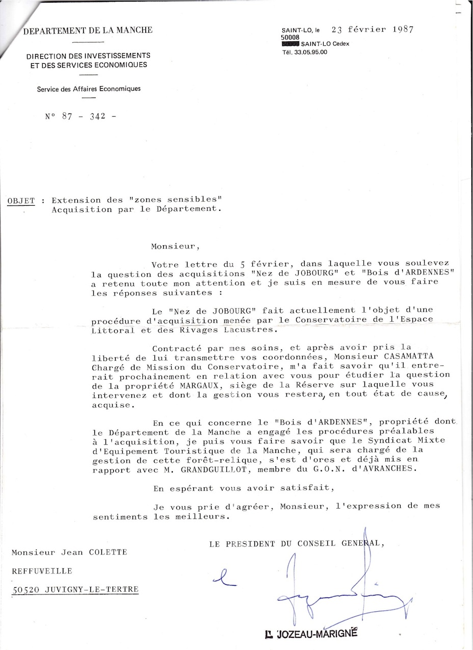 Courrier en réaction au nom du Groupe ornithologique normand (le Nez-de-Jobourg est à cette date intégré dans le réseau des réserves du GONm.)