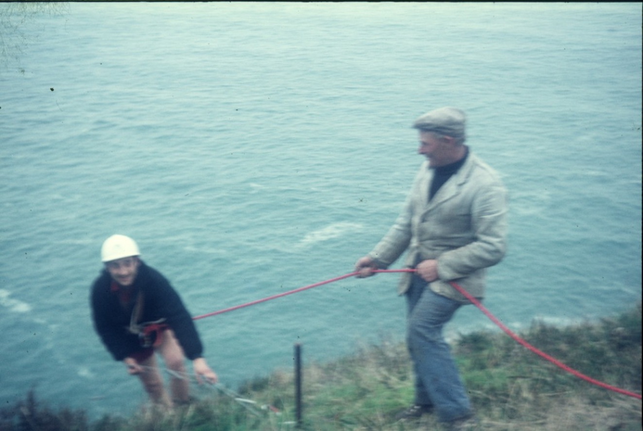 Cette photo de Jacques descendant en rappel pour inspecter une aire de grand corbeau résume le grand intérêt qu'il porte au site et à l'espèce en particulier dès cette époque. Le Nez-de-Jobourg est en réserve depuis mai 1966, le site étant loué à la propriétaire. Mademoiselle Lecourtois en est le conservateur, son statut de secrétaire départementale de la Société pour l'Etude et la Protection de la Nature en Bretagne et Cotentin suffisant à rappeler le rôle capital qu'elle va jouer à cette époque dans la mise en réserve de plusieurs sites majeurs du département de la Manche. Plus tard, Jacques deviendra à son tour propriétaire du site pour assurer la pérennité du statut de la réserve.