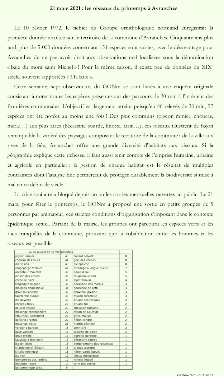 Une synthèse a ensuite été présentée le dimanche 21 mars suivant, dans une conférence de presse sur le perron de la mairie, en présence de représentants de la commune, d'adhérents du GONm, de correspondants de presse et d'un peu de public. Une sortie rapide dans certains quartiers de la ville a ensuite permis de souligner la capacité d'accueil d'une zone urbaine pour de nombreux oiseaux, espaces boisés avec buissons et vieux bois, habitat ancien, vieux murs, pelouses, etc. Cette sortie d'observation s'est effectuée dans le respect de règles sanitaires : masque obligatoire, distance entre participants et petits groupes de maximum.