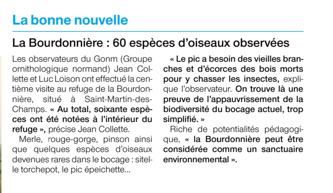 Le premier article résume de façon rapide le bilan ornithologique de 100 sorties sur le refuge de la Bourdonnière à Avranches-Saint-Martin-des-Champs (50). C'est déjà bien mais le document fourni était nettement plus copieux et disert.