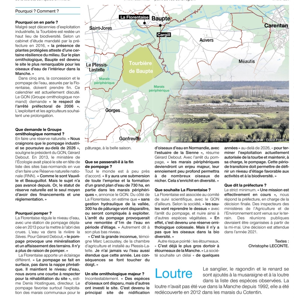 Voici une page de Ouest-France consacré à l'avenir de la tourbière de Baupte/50. Le GONm est partie prenante de la discussion. En effet, le dossier constitué par le GONm pour étayer le projet de réserve est solide, basé sur un suivi ancien et long de l'avifaune de cet site exploité auparavant pour sa tourbe. Sera-t-il suffisamment convaincant face aux oppositions des uns et des autres et à leurs intérêts économiques? La biodiversité gagnera-t-elle, pour une fois?