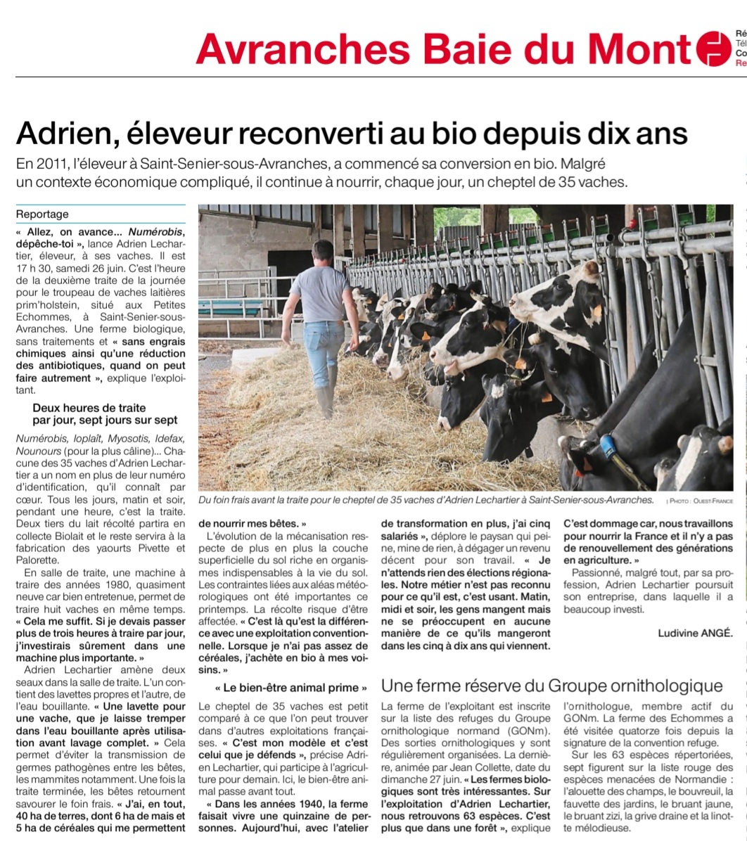 Cette opération est présentée dans l'article de Ouest France ci-dessous. Une partie du voyage a eu lieu dans la ferme de Adrien Lechartier à Saint-Senier-sous-Avranches (50). C'est une animation croisée entre l'exploitant qui présente ses pratiques et le naturaliste qui en souligne le bénéfice qu'en tire la vie sauvage.