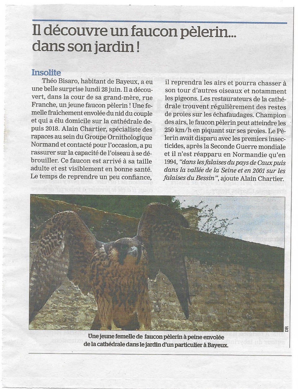 Une mésaventure semblable à celle qui est arrivée à un jeune faucon pèlerin avranchinais s'est produite à Bayeux. Une jeune femelle originaire de la cathédrale de Bayeux s'est retrouvée dans un jardin environnant. Le Bessin Libre rapporte l'événement avec l'avis éclairé d'Alain Chartier du GONm.