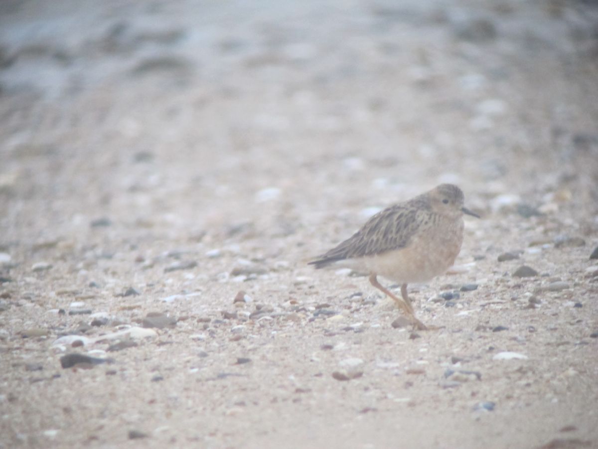 "Mercredi soir, ayant décidé d’aller rejoindre la sortie auditive, organisée par Bruno à Ouistreham, je suis allé, auparavant, sur la plage du Home Merville, histoire de faire le point sur la nidification en cours des GCI (gravelot à collier interrompu) . Pluie et brouillard sont malheureusement au rendez-vous. En balayant la plage (marée basse) où peu de gravelots çà collier interrompu sont visibles, la lunette passe devant des grands gravelots, des bécasseaux variables et sanderling et… tiens, un bécasseau à pattes jaunes, donc un oiseau rare. C’est lui qui va focaliser l’attention et l’approche pour si possible quelques photos, pas simples avec ces intempéries !