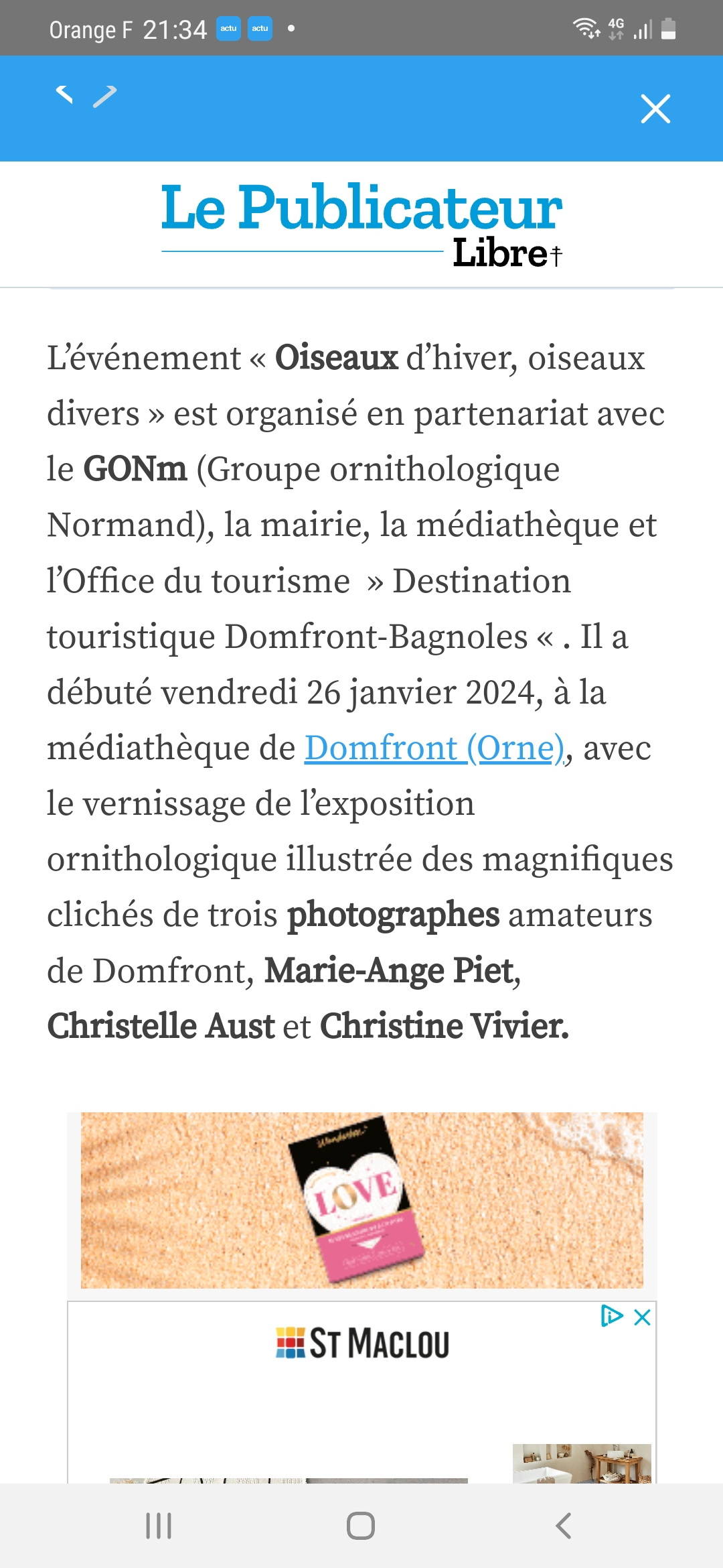 Thomas qui est technicien GONm en Seine-Maritime a lancé un cycle d'animations publiques et de formation des adhérents dans ce département. Ici "Le Réveil journal" de Neufchâtel-en-Bray rend compte d'une animation qu'il a organisée en forêt d'Eu à l'occasion du grand comptage des oiseaux de jardin 2024. Cette animation était financée par le département.