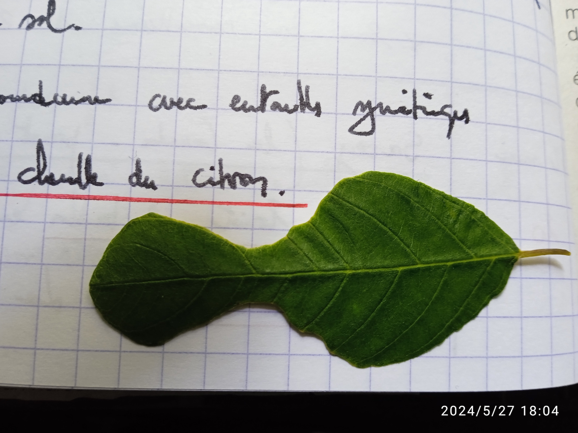 Au cours du relevé sur le refuge, un indice de passage du papillon Citron : les encoches symétriques de sa chenille sont caractéristiques. Le même buisson de bourdaine était aussi occupé par cette chenille le 27 mai 2022!