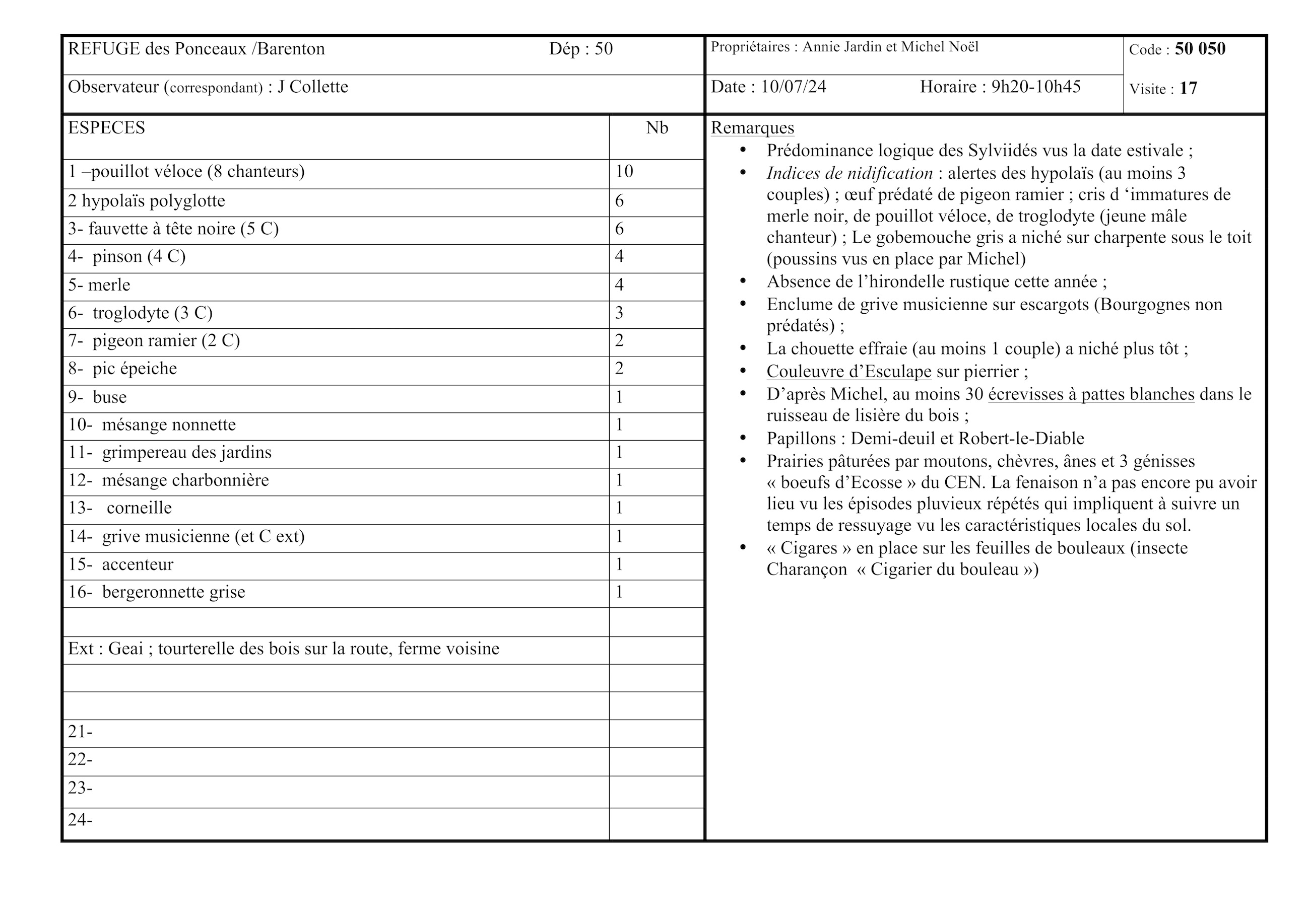 Profitant d'une rencontre avec Jean-François Arondel destinée à préciser quelques détails relatifs au fonctionnement des refuges, nous avons parcouru une partie du site, bien silencieux en cette période de mue. La liste d'espèces s'est cependant allongée de 10 nouveautés et atteint 34 espèces en deux visites.