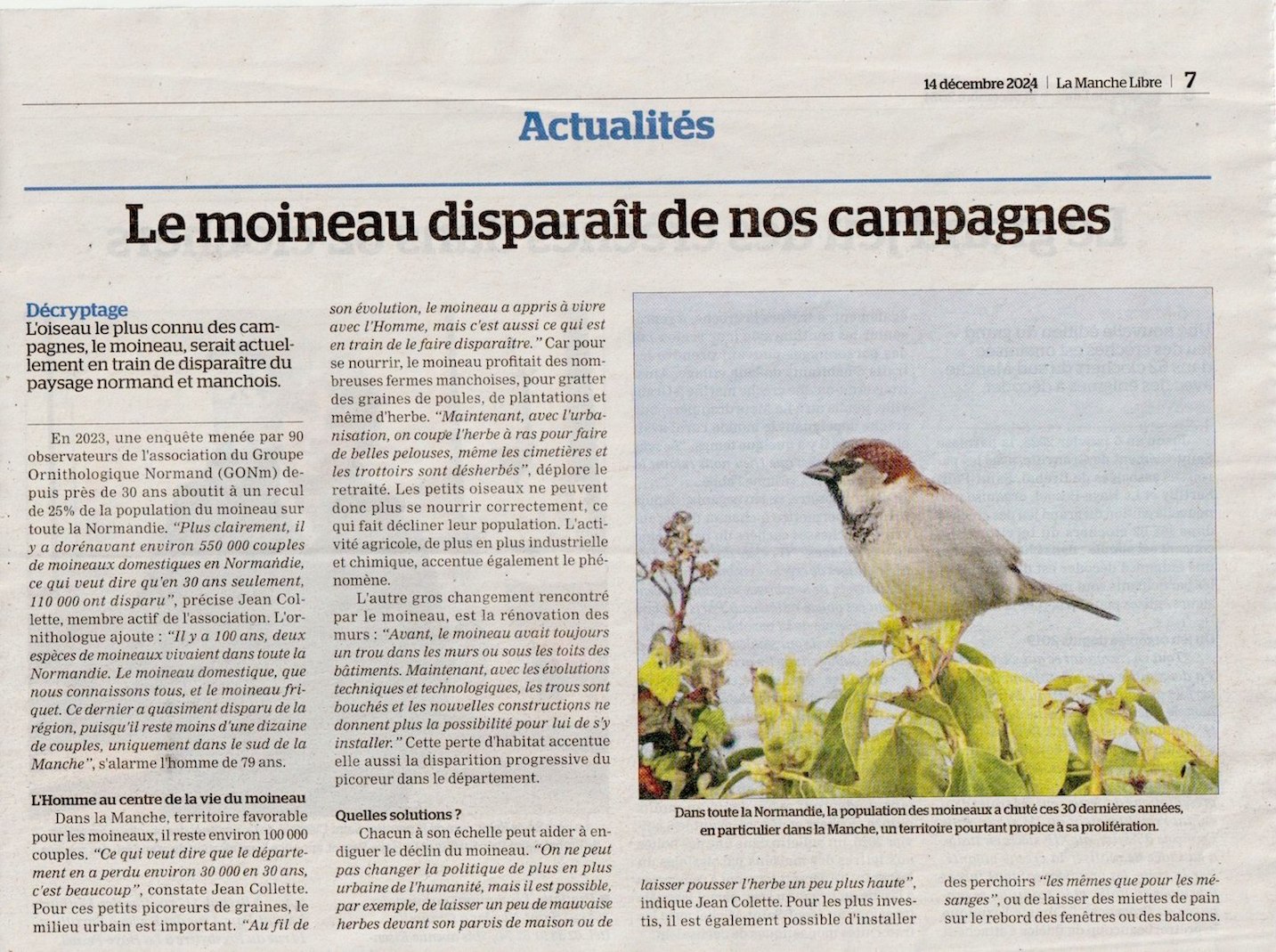 Retombée inattendue d'un communiqué envoyé il y a un mois aux trois journaux du Sud-Manche (COP, biodiversité locale et Tendances), un journaliste (spécialisé dans les articles sportifs à la Manche Libre de Saint-Lô...) a écrit cet article après m'avoir contacté au téléphone.