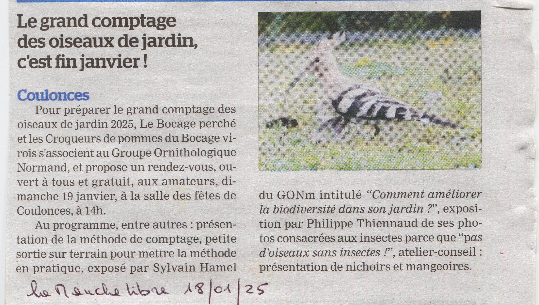 Cet après-midi organisé par le GONm, l'association locale du Bocage Perché et les Croqueurs de pomme du bocage virois comportait une conférence de Sylvain Hamel sur les aménagements et les pratiques possibles pour attirer les oiseaux au jardin, une présentation du protocole de comptage, une sortie de mise en pratique. Une exposition sur les insectes était aussi présentée dans la salle de Coulonces/14.