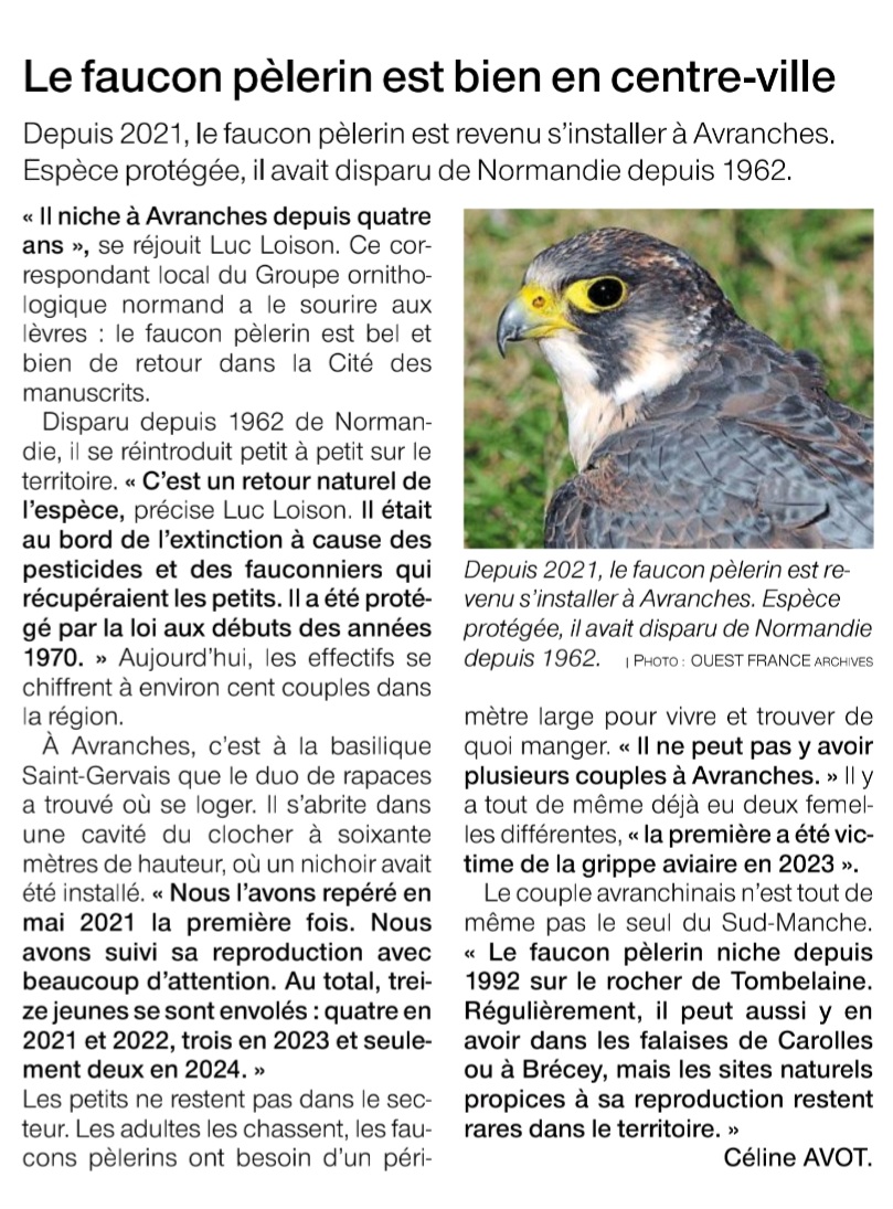 Hier le 15 mars dans l'édition d'Ouest France Avranches est paru un petit article sur la reproduction du faucon pèlerin dans le clocher de la basilique Saint Gervais.