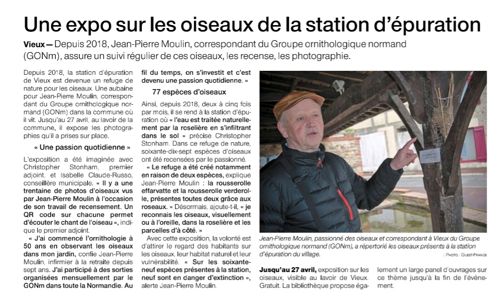 La station d'épuration de la commune de Vieux (STEP) est un refuge de nature GONm. Il bénéficie d'un suivi particulier par Jean-Pierre Moulin adhérent bénévole du GONm. Jean-Pierre présente sous le lavoir de Vieux le fruit de ses prospections. L'événement est relaté dans Ouest-France.
