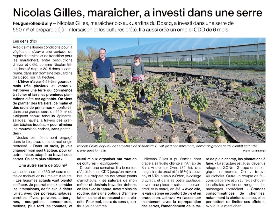 Sur fond d'information professionnelle, l'article précise le fait que la "structure" est un refuge du GONm. On peut remercier Nicolas pour son attachement à notre association parallèlement à son travail de maraîcher. L'occasion aussi de remercier notre collègue Martin Billard, correspondant de ce refuge et actif dans le "recrutement" de nouveaux refuges sur sa commune!