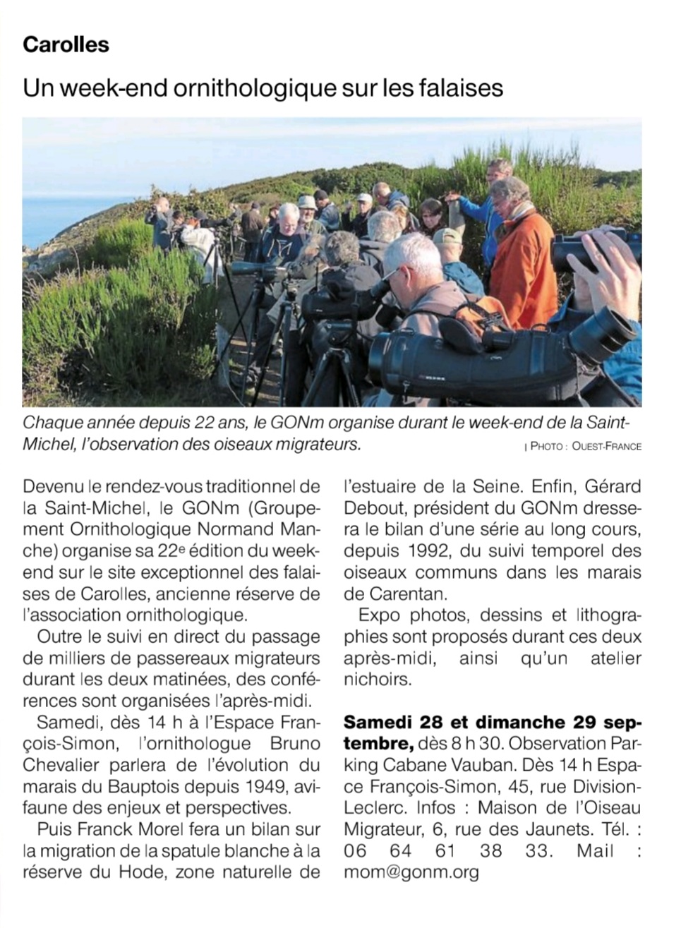 Voici un très bon article de Ouest-France : la rédactrice était présente sur la falaise et sous la pluie, le matin du samedi 28 septembre. Pour le reste, suivre ce lien où Claire Debout, organisatrice de cet événement, relate ces deux journées d'ornithologie. viewtopic.php?p=9065#p9065