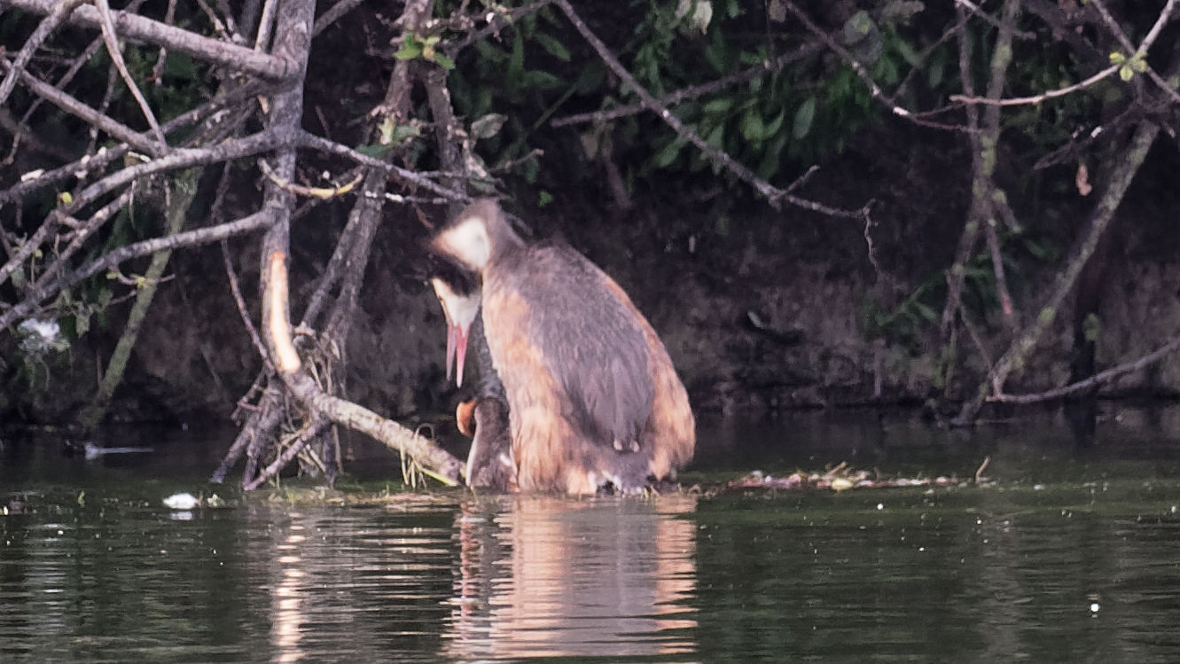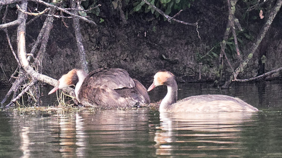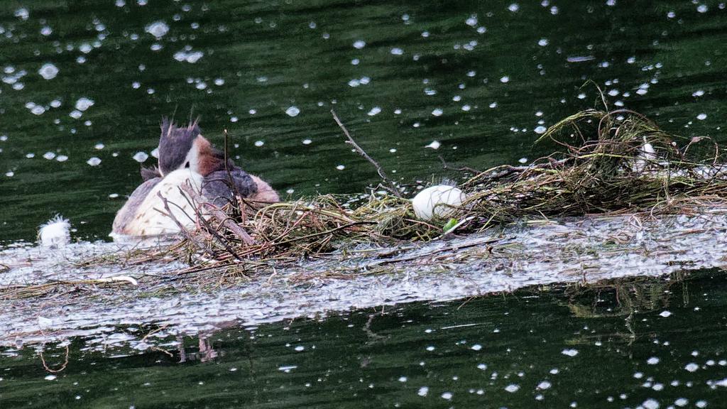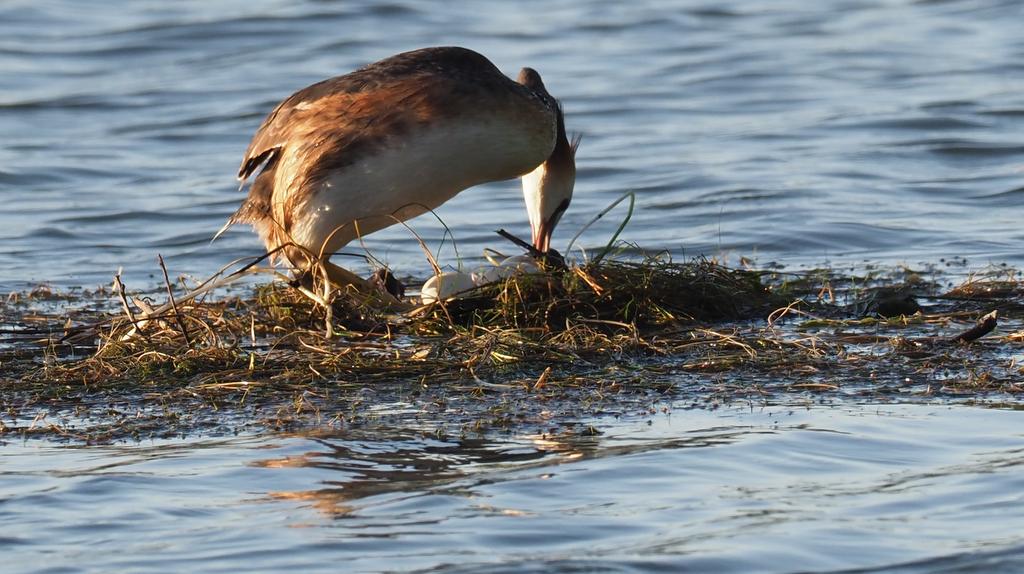 Le 2 Août en fin de soirée je passe au plan d'eau de Villers et j'aperçois un nid. Après une courte période d'observation je constate que c'est un nid de grèbes huppés, qu'il contient un oeuf et qu'il est situé assez loin du bord, ni abrité , ni caché par des branches d'arbres. Les adultes s'affairent à le consolider et passent peu de temps à couver. Je n'avais pas remarqué ce nid la veille. Le lendemain je repasse et constate que les grèbes continuent à consolider leur nid et passent peu de temps à couver. Je continue à prendre des photos et je constate peu de temps après que le nid contient 3 oeufs ! Je repasse les jours suivants, les grèbes se sont enfin mis à couver. Que va donner cette saison 2 ? Les oeufs vont-ils éclore ?