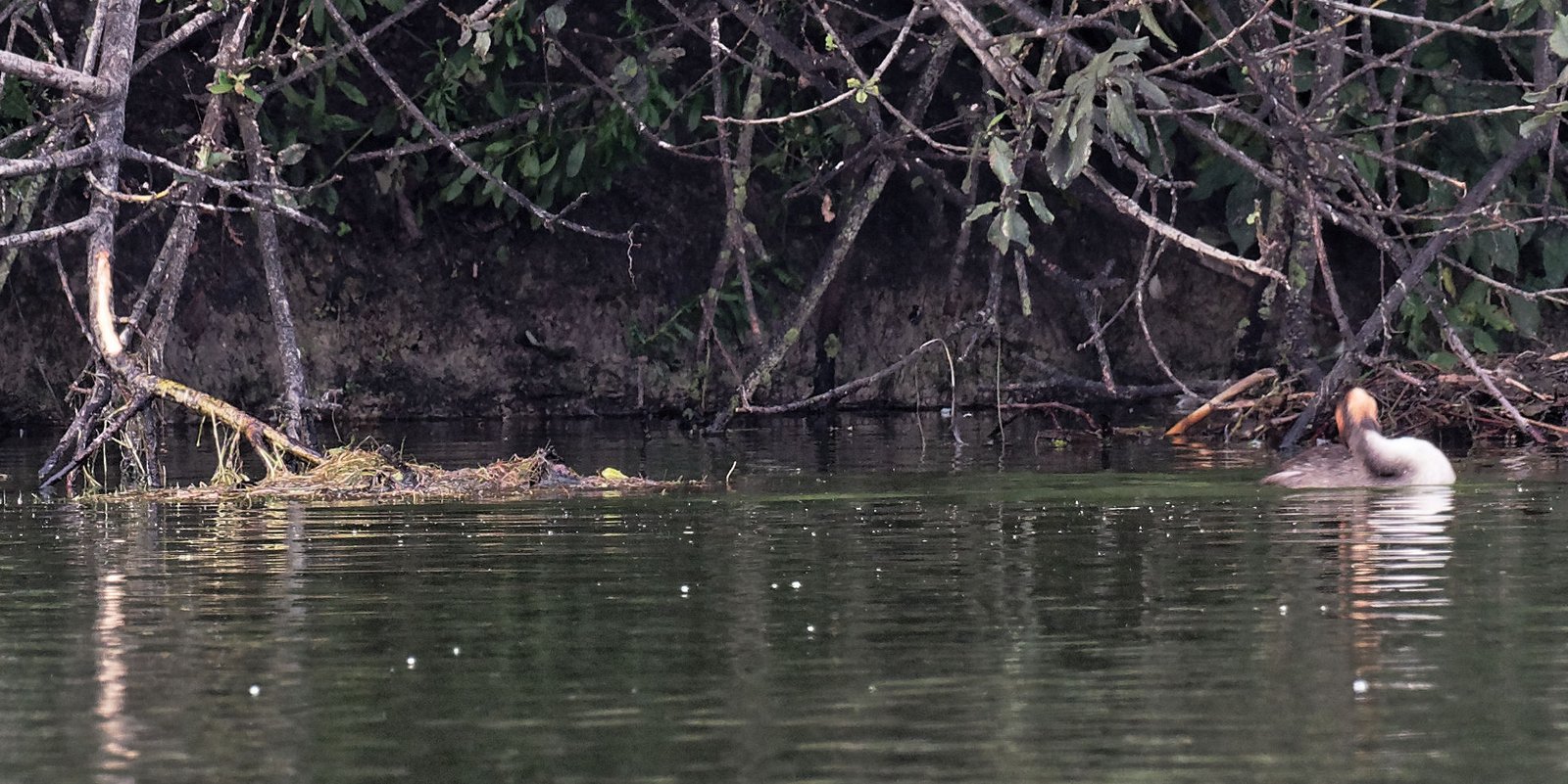 Le 12 Août en matinée je passe au plan d'eau pou voir où en est le nid de grèbes. Il a totalement disparu. Les branches, piquées dans la vase, qui ancraient ce nid sur l'eau ont aussi disparu. En discutant avec un autre photographe, j'apprends qu'il a disparu depuis le 9 Août, et que c'est la troisième tentative de construction de nid de la saison. Je vais continuer à surveiller l'activité des grèbes.